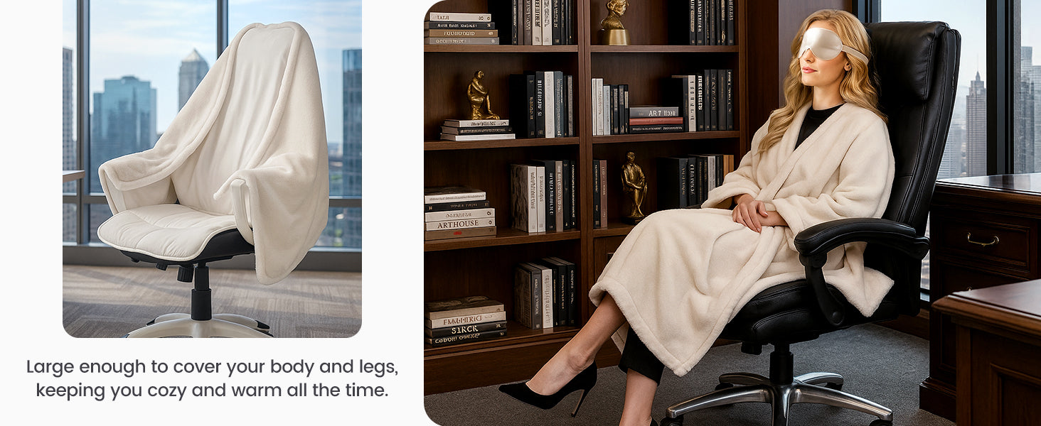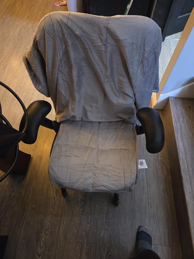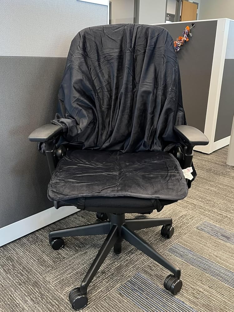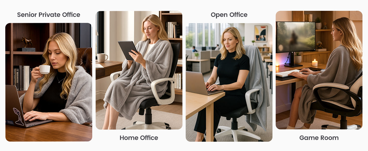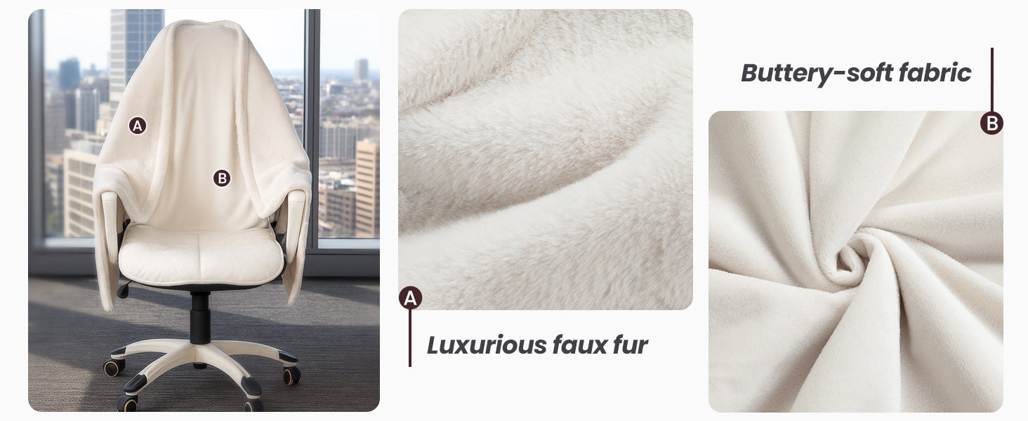 Our desk chair blanket uses a One Size Fits All design that fits most standard office chairs—from basic task chairs to mid-back executive styles.