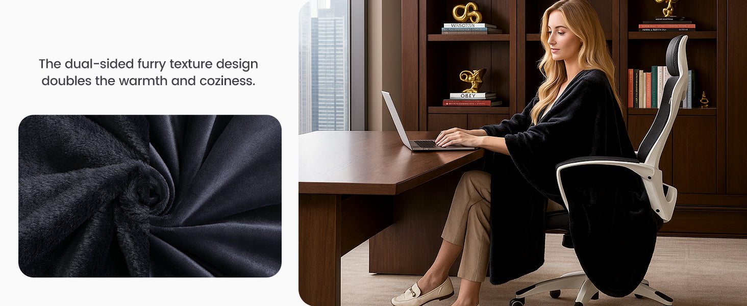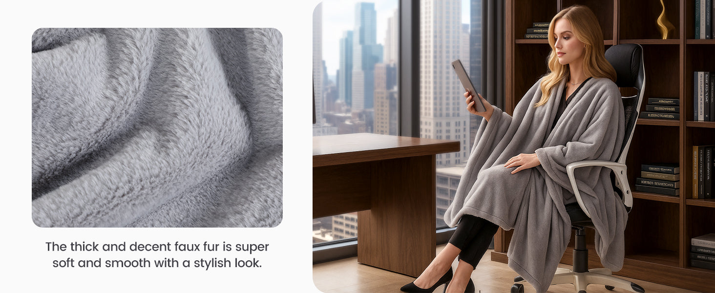 Drape naturally over shoulders and knees for full-body warmth. Soft faux fur front and ultra-soft lining for all season comfort.
