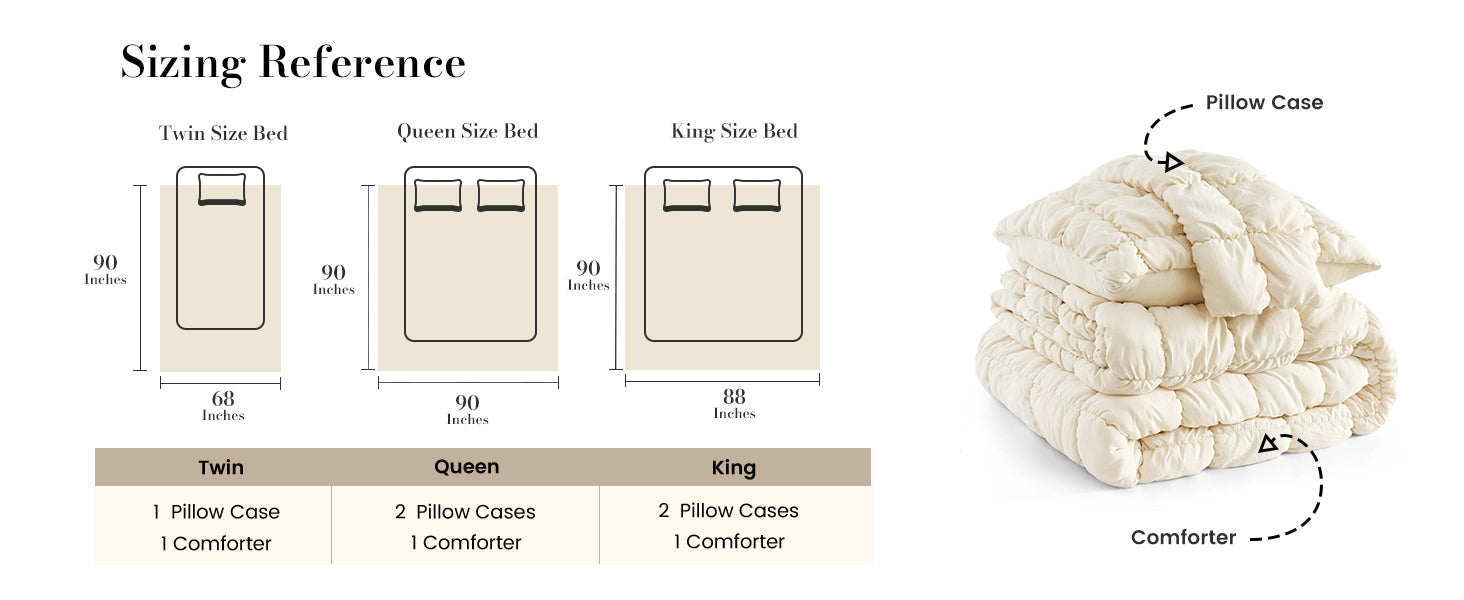 - Queen-size: 1 Queen-size comforter (90" × 90") + 2 matching pillowcases (20" × 26").