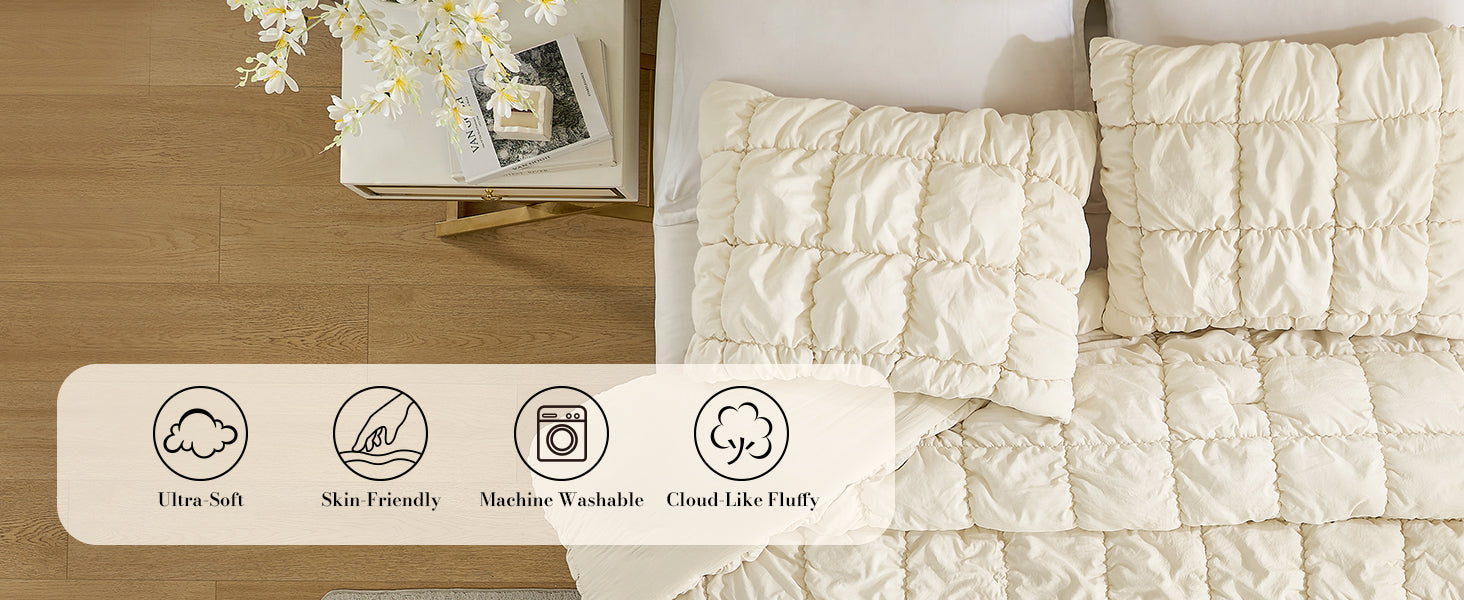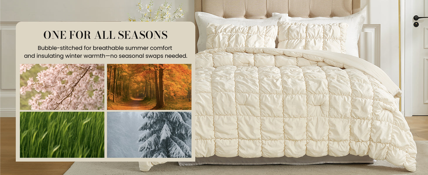 Experience the unique 3D bubble texture of our All-Season Bubble Comforter Set. Ultra-soft, breathable, and lightweight for year-round comfort.