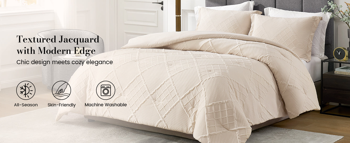 Instantly refresh your bedroom with the unique windowpane jacquard texture. Its elegant yet modern style adds dimension, romance, and sophistication, blending seamlessly with modern, boho, or classic decor while elevating your bedroom or guest room atmosphere.