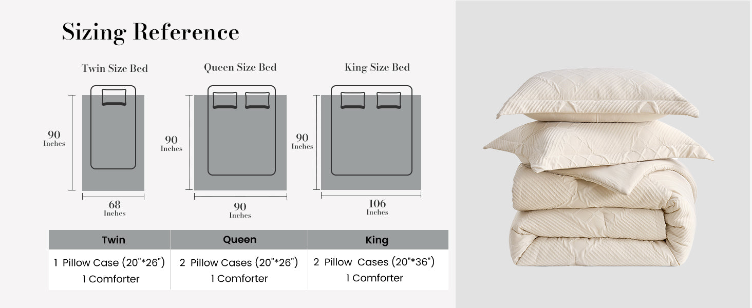 - King-size: 1 King-size comforter (106" × 90") + 2 matching pillowcases (20" ×36").