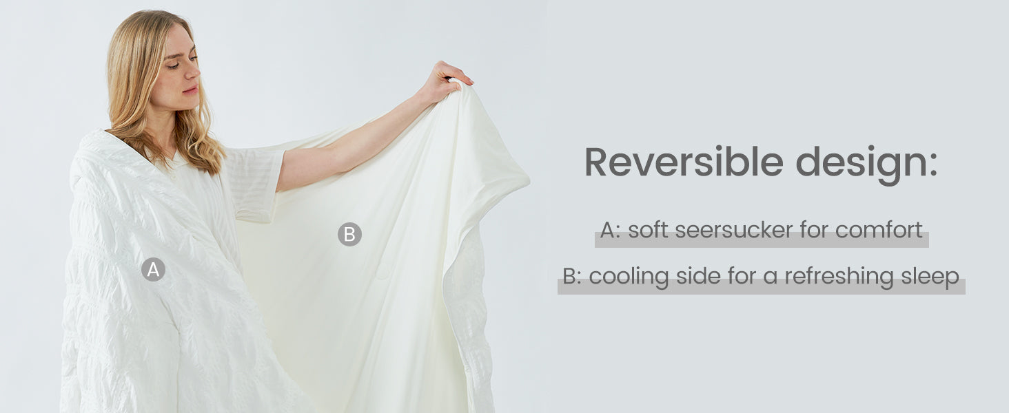 Stay cool and comfortable with a comforter that offers two experiences. Flip to the cooling side for restful nights, or the breathable seersucker side for cozy warmth. Its textured design is seamlessly stylish and versatile.