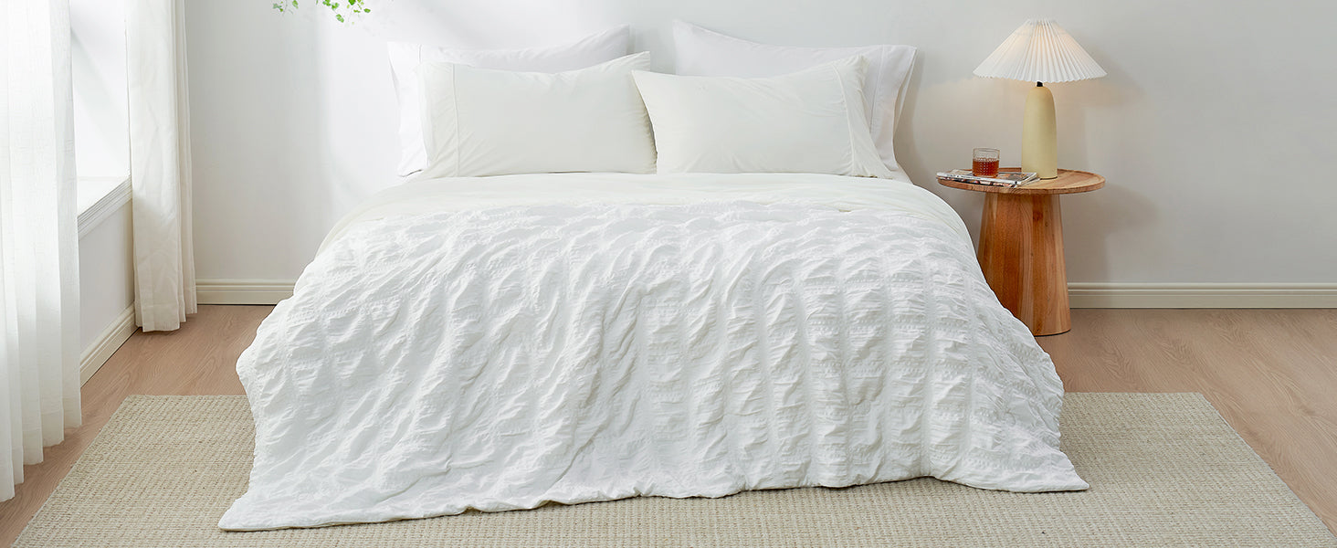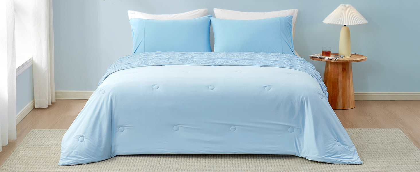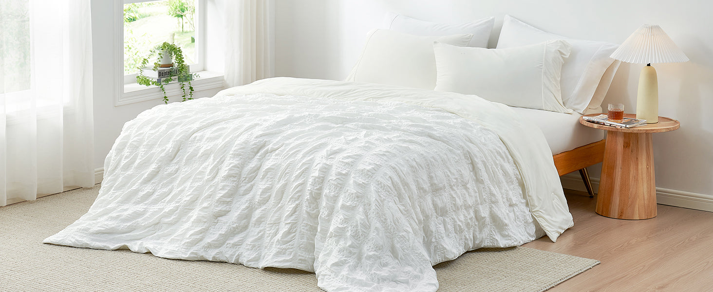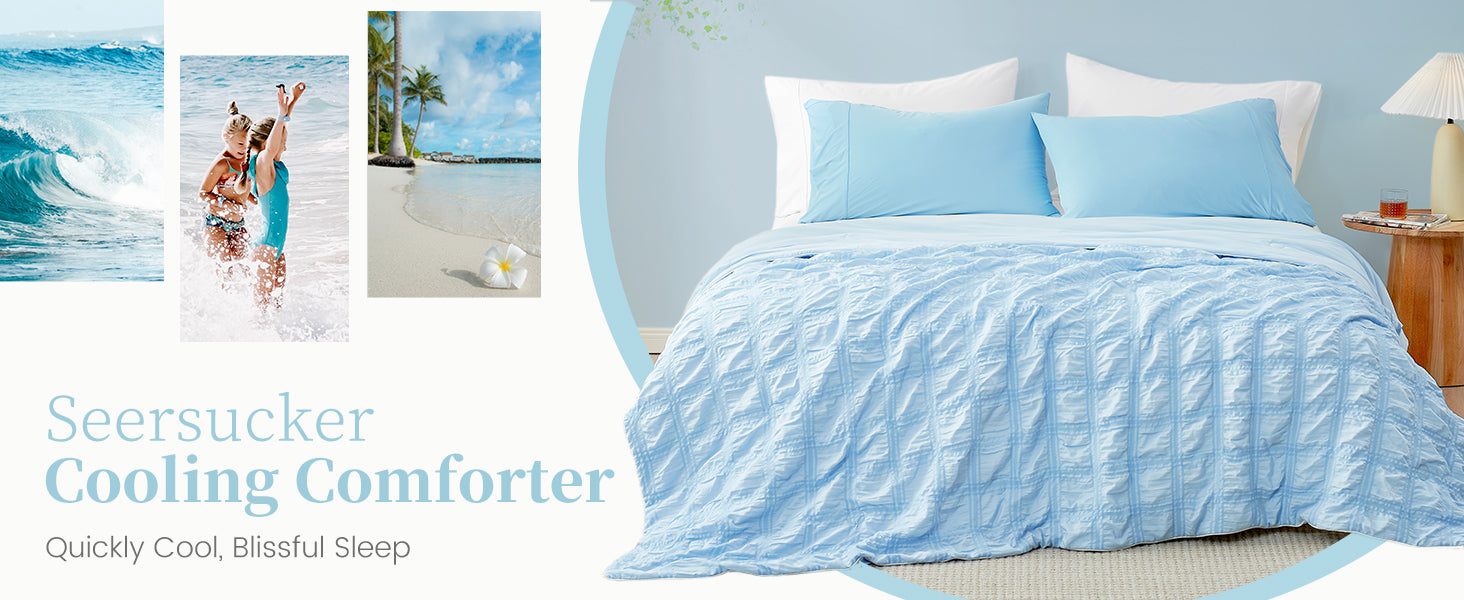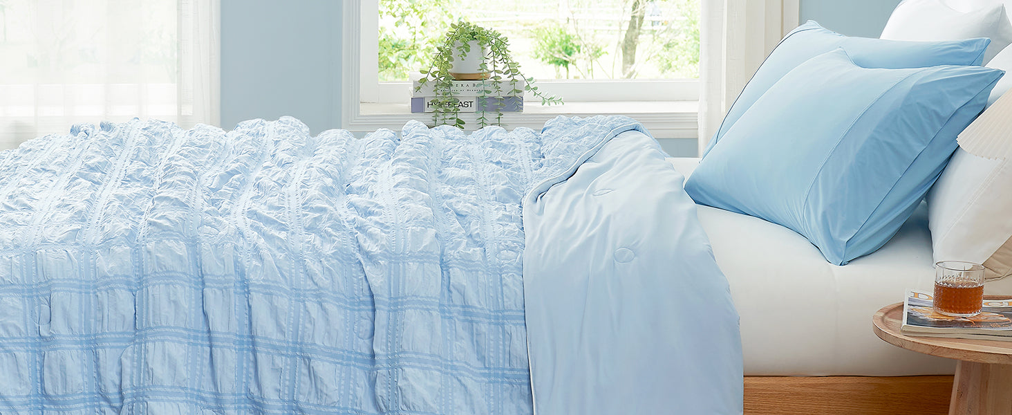Style meets smart comfort. Our seersucker plaid comforter features double-sided cooling and anti-static fabric to keep you cool and static-free all night. Breathable, lightweight, and perfect for hot sleepers.