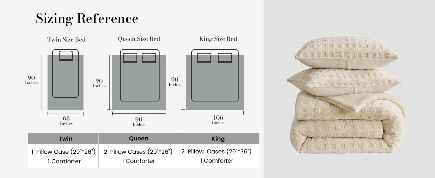 - King-size: 1 King-size comforter (106" × 90") + 2 matching pillowcases (20" ×36").