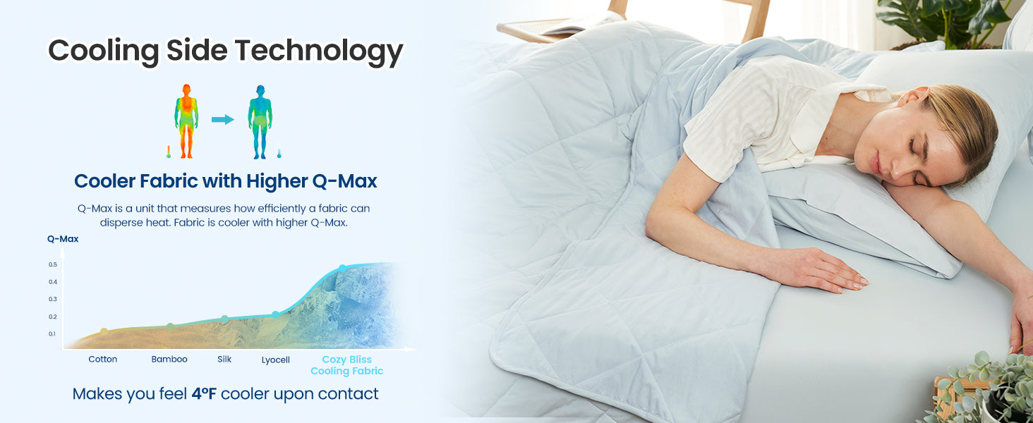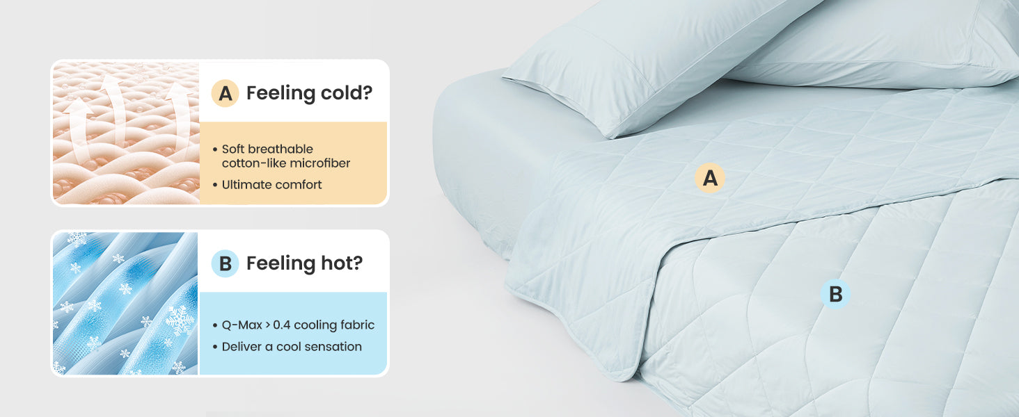 One side is made with innovative Japanese cooling fabric, ideal for hot sleepers, while the reverse side offers soft, breathable comfort—perfect for every season. The Q-Max>0.4 cool-touch fabric instantly draws heat away from your body, helping regulate temperature and improve sleep quality.