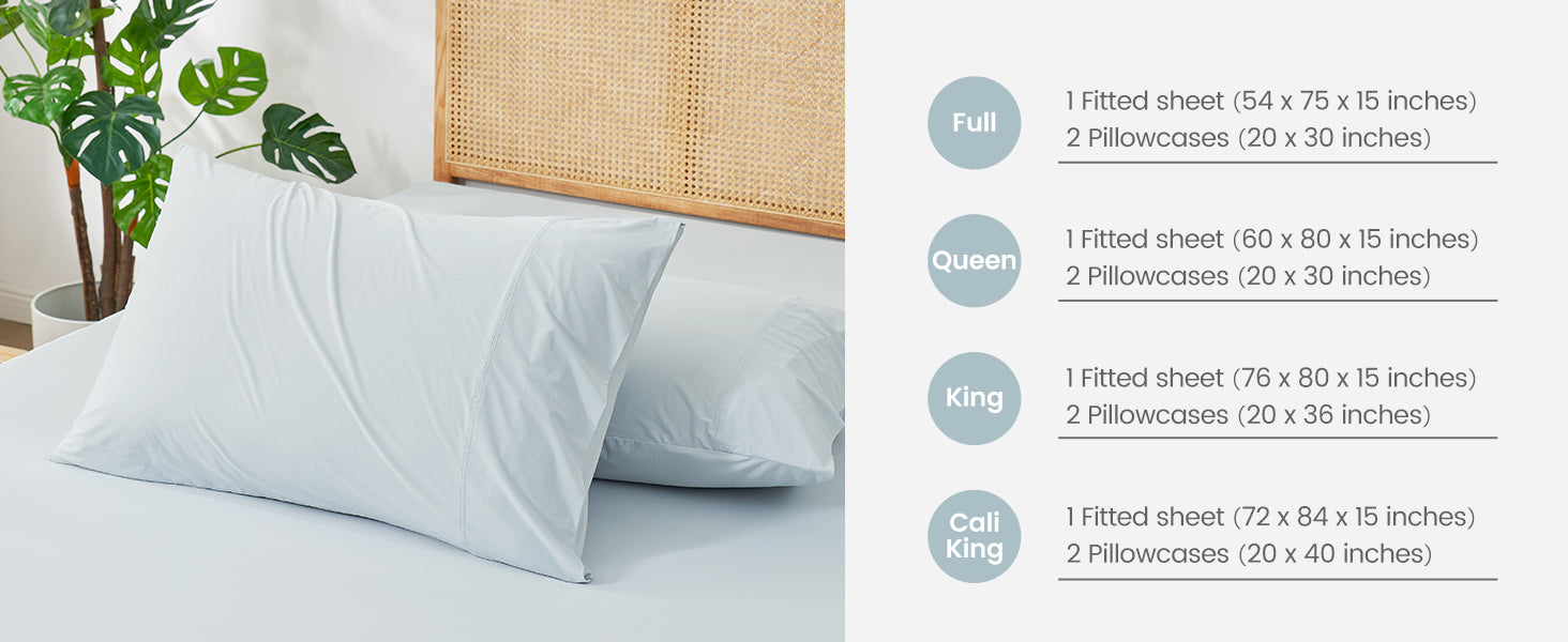 - Full: 1 Fitted Sheet (54" x 75" x 15") + 2 Pillowcases (20" x 30")
