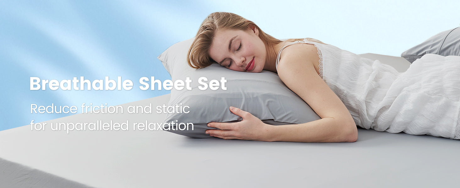 Experience all-night comfort with our Cooling Bed Sheet Set! The fitted sheet offers a perfect, snug fit on your mattress, while the matching pillowcases complete your sleep sanctuary. Made from silky-smooth cooling fabric, the set feels luxuriously soft against your skin and promotes breathability to keep you cool all night.