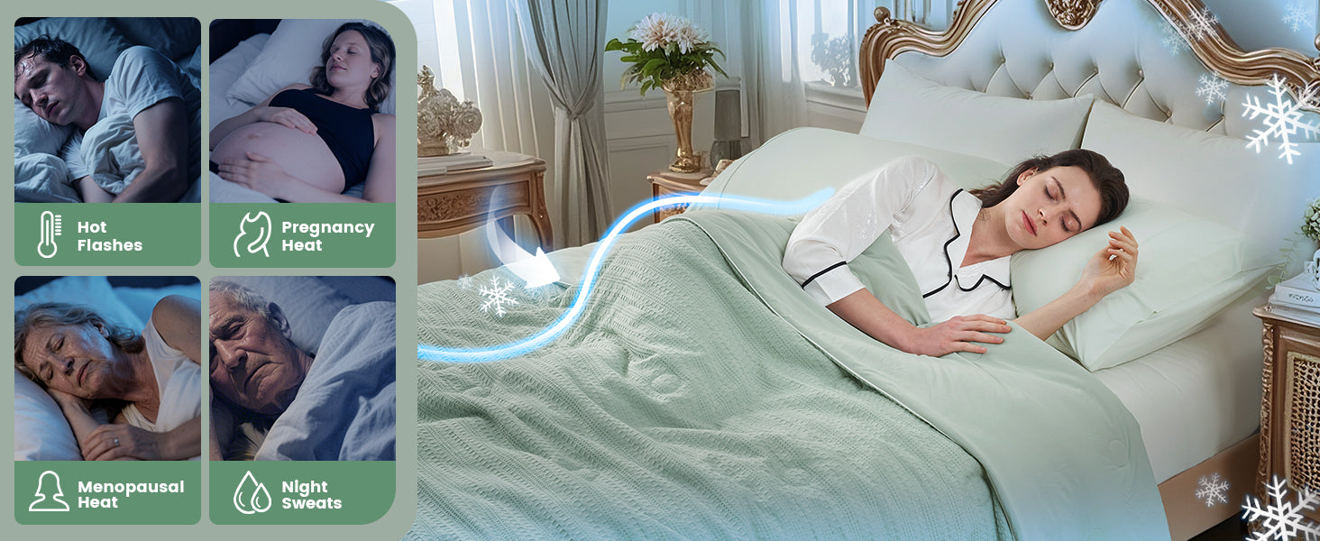 - Dual-Sided Design for Versatility: Our waffle cooling comforter features a classic waffle texture on one side and advanced cooling fibers (Q-Max > 0.45) on the other, which quickly dissipate heat to reduce temperatures by 2-5°C. Perfect for hot sleepers and those prone to night sweats, it ensures a cool and dry sleep all night.