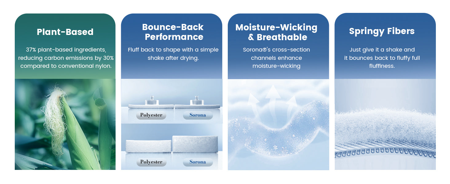 - Breathable Sorona Filling: This summer cooling comforter is filled with DuPont Sorona, a plant-based material that is hypoallergenic, highly breathable, and moisture-wicking. Its unique spiral structure offers exceptional resilience, keeping the blanket fluffy and long-lasting even after washing.